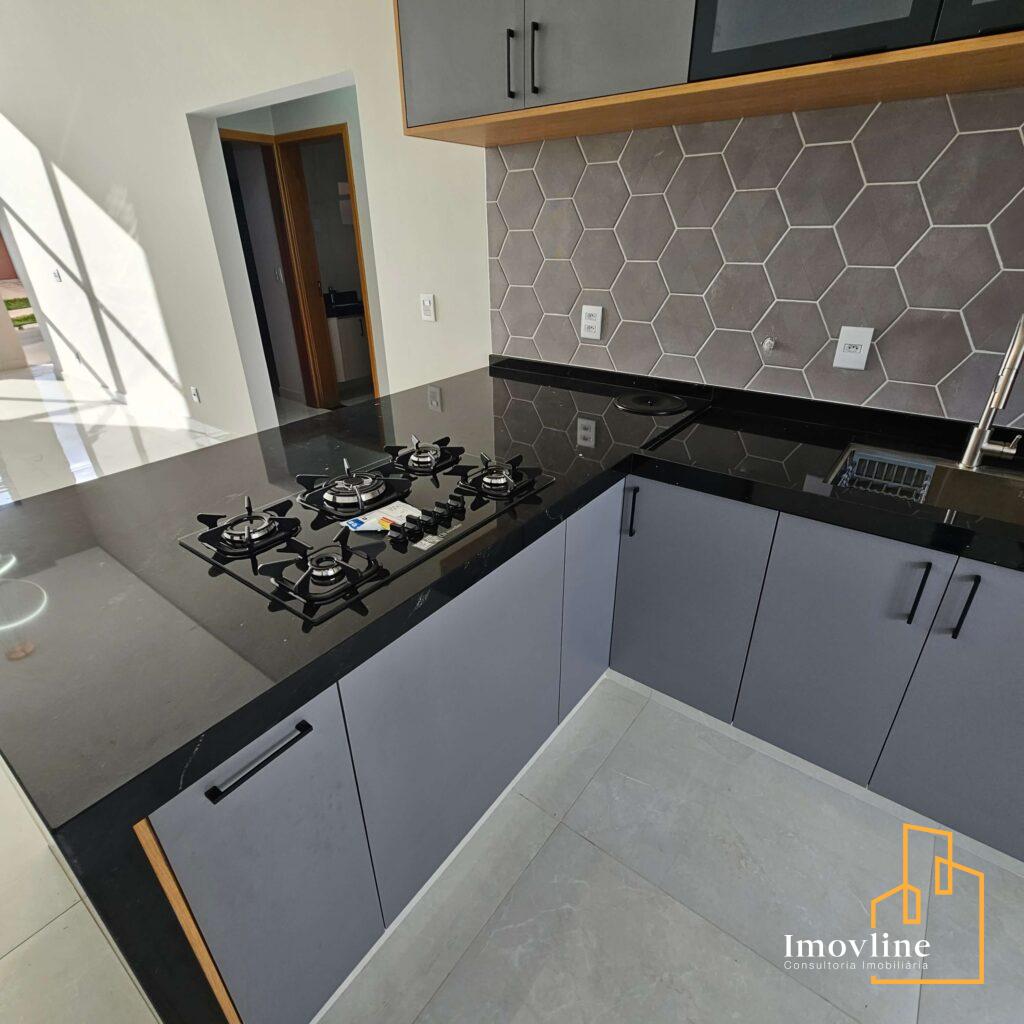 Logo ao entrar, a sala de estar com pé direito alto garante amplitude e iluminação natural, criando um ambiente acolhedor e sofisticado. Na sequência, a cozinha, equipada com móveis planejados, se revela como o espaço perfeito para quem valoriza praticidade e bom gosto.