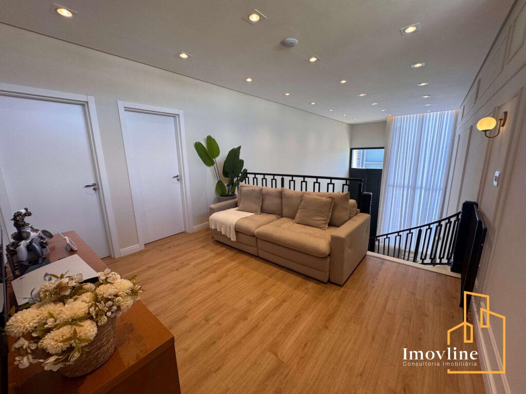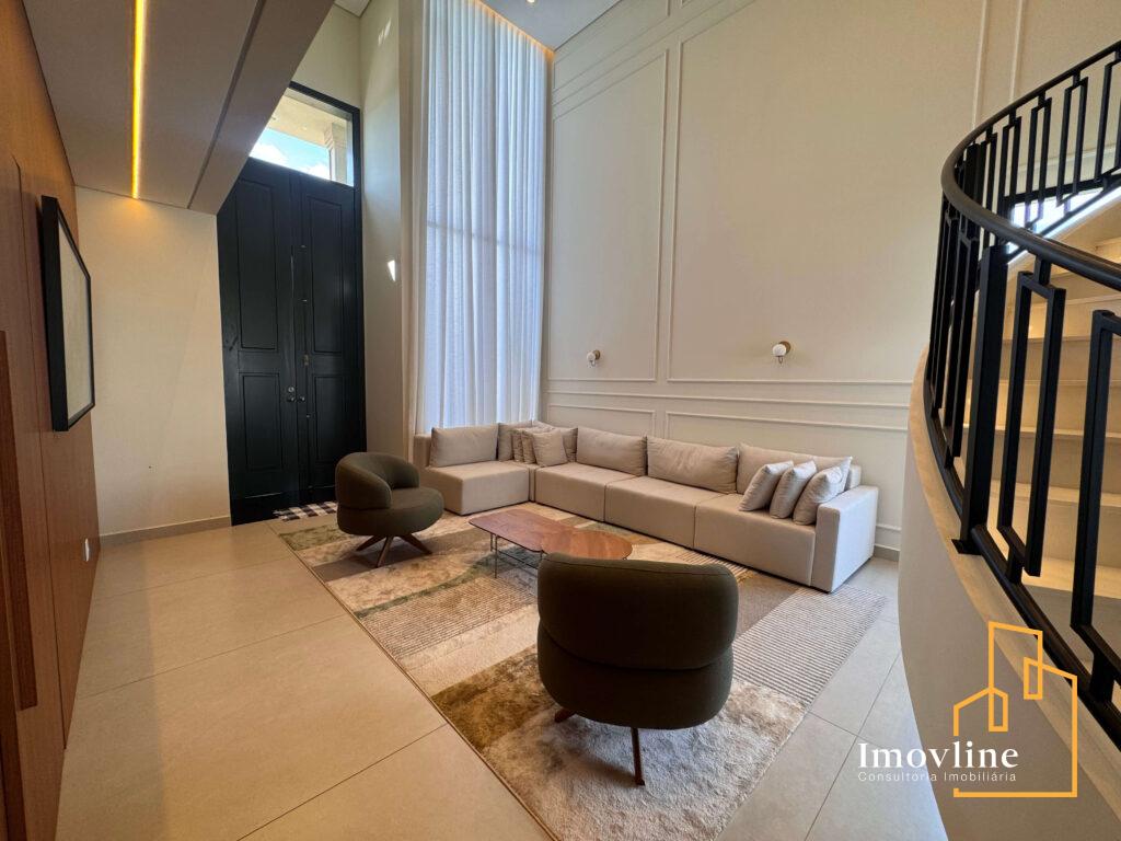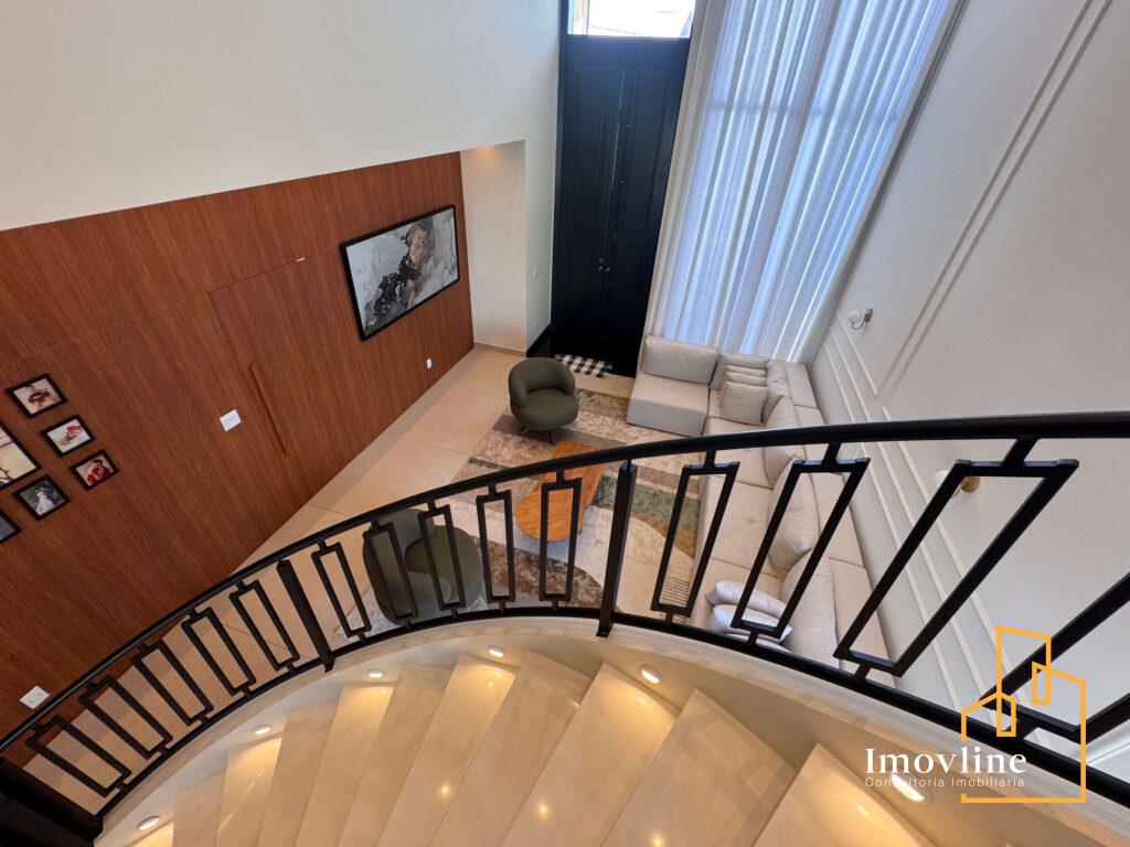 Logo na chegada, a casa impressiona com sua fachada imponente, paisagismo cuidadosamente planejado e um living com pé-direito duplo, que proporciona amplitude, iluminação natural abundante e um grande impacto arquitetônico. A escada curva com guarda-corpo em ferro reforça o charme clássico e elegante do projeto.
