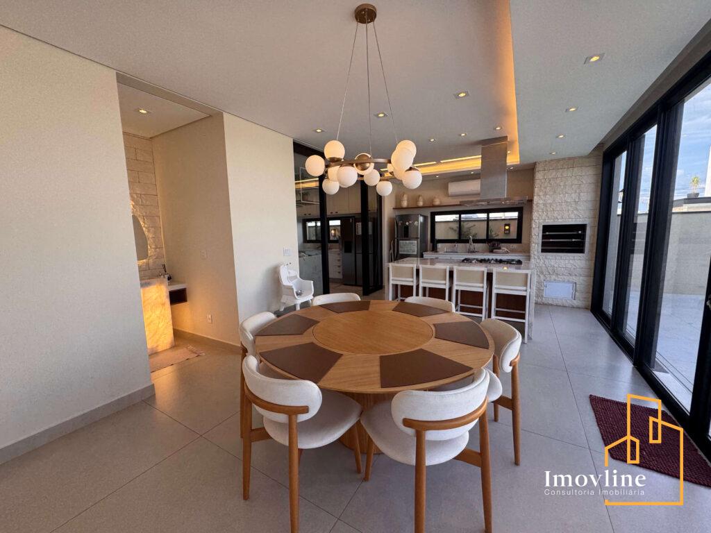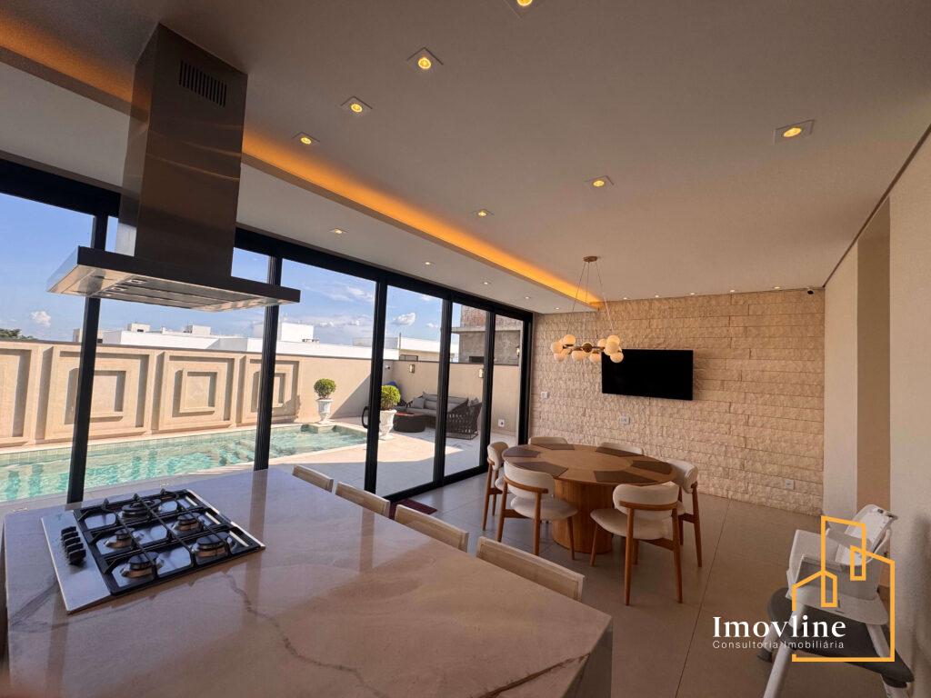 A área social foi pensada para valorizar os momentos em família e receber convidados com conforto. A residência conta com ampla sala de estar, cozinha planejada com ilha central integrada à área gourmet, além de grandes portas de vidro que garantem excelente iluminação natural e integração com o espaço externo.