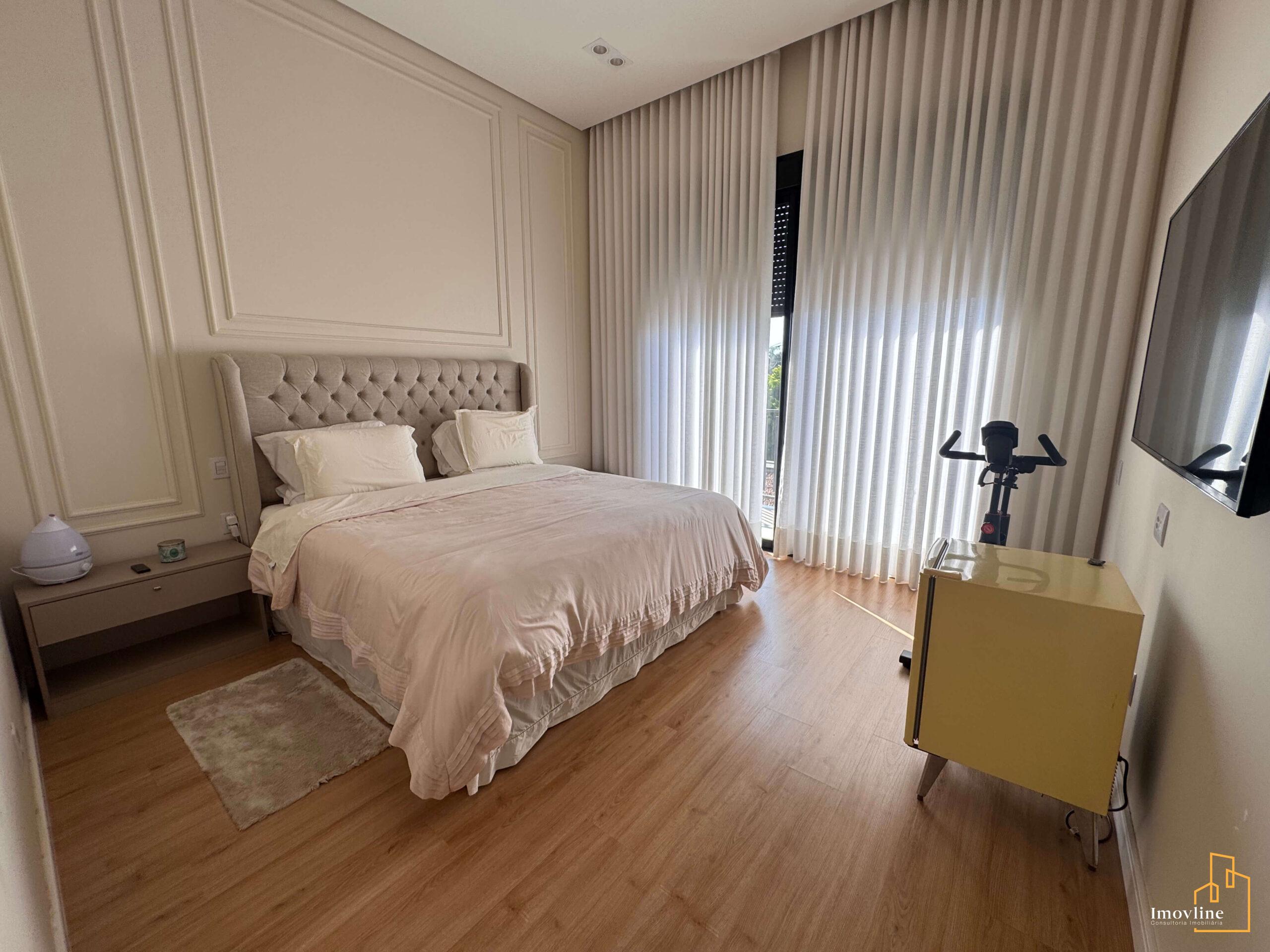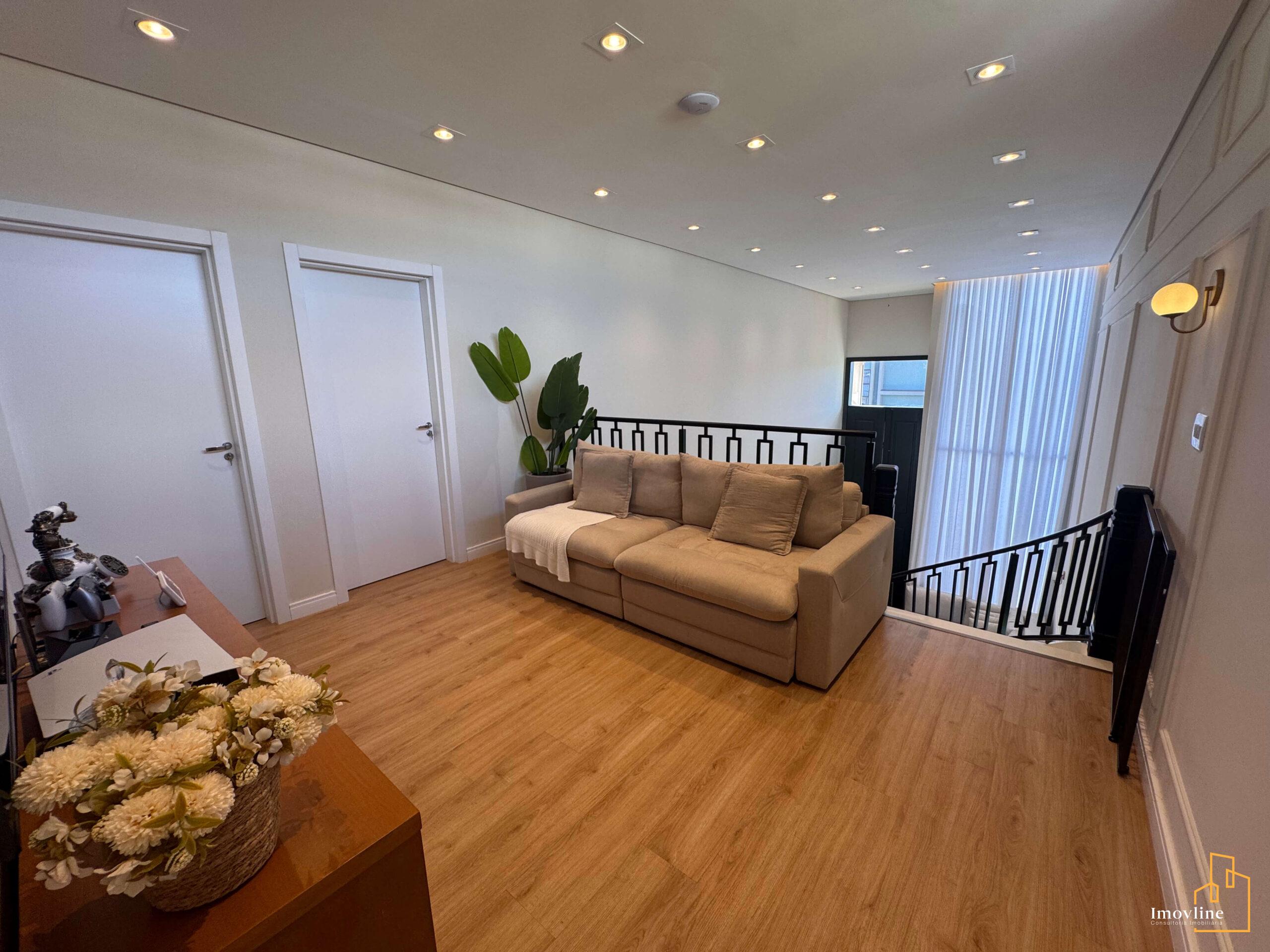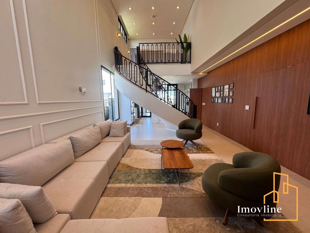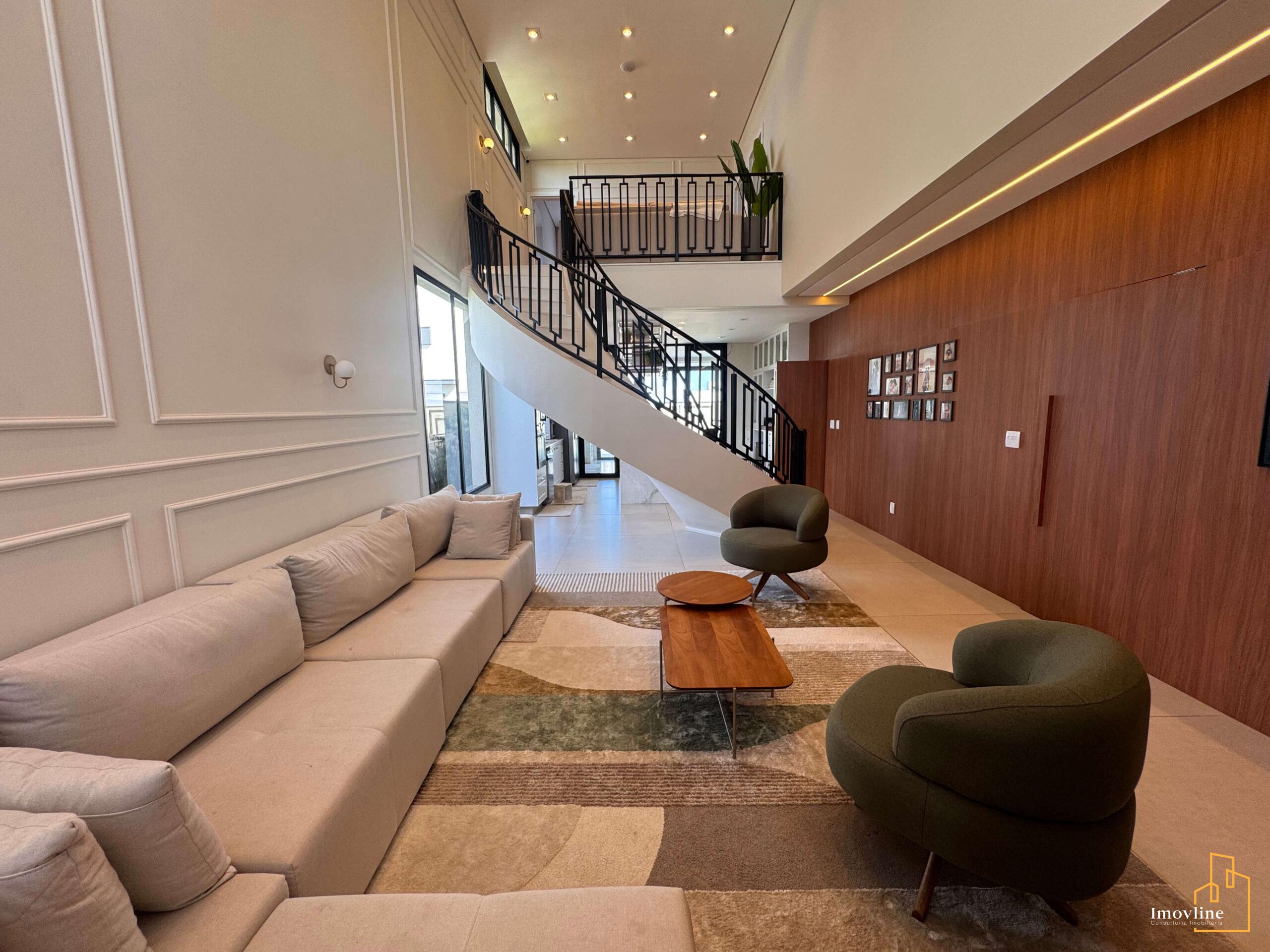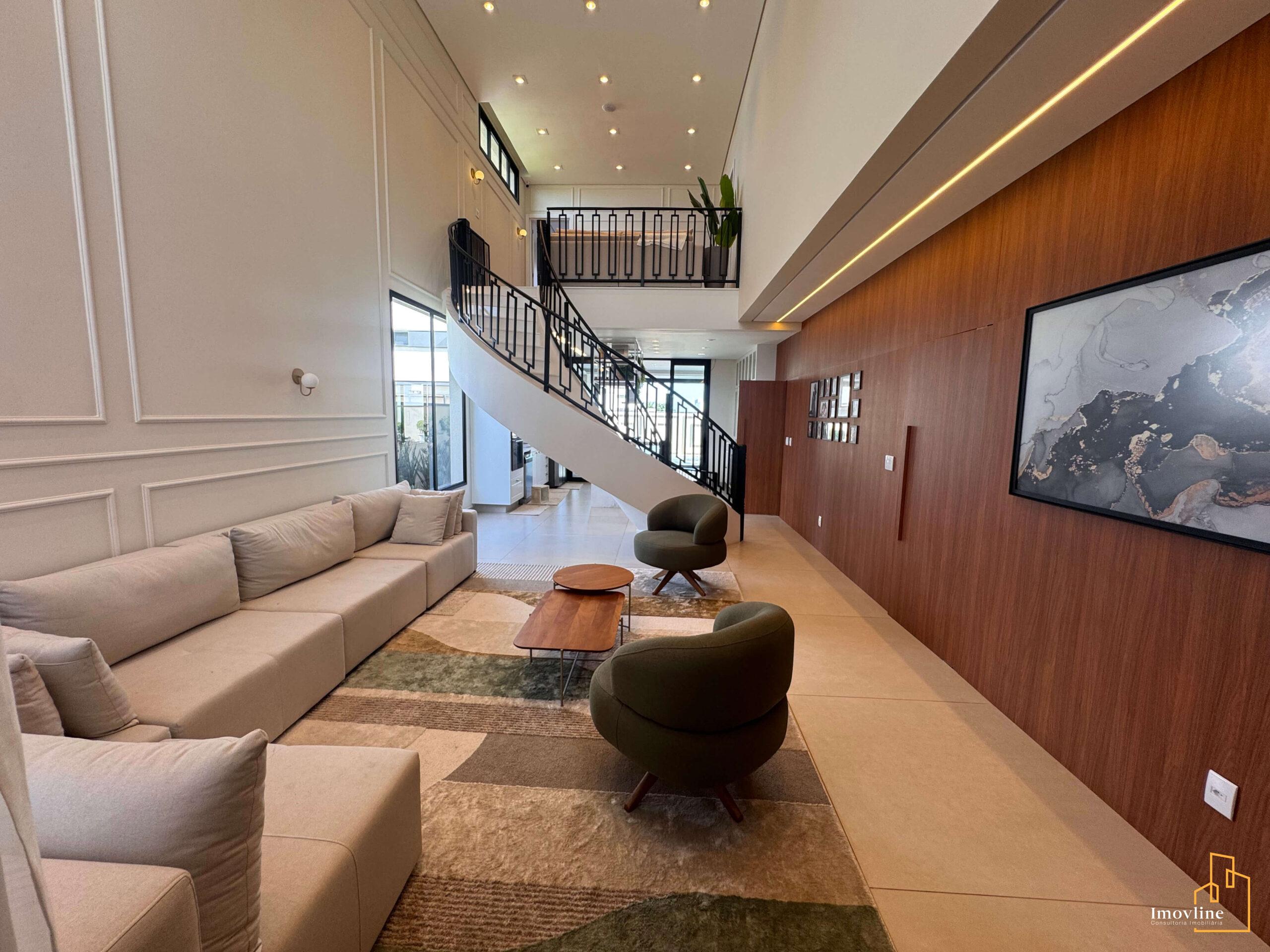 Logo na chegada, a casa impressiona com sua fachada imponente, paisagismo cuidadosamente planejado e um living com pé-direito duplo, que proporciona amplitude, iluminação natural abundante e um grande impacto arquitetônico. A escada curva com guarda-corpo em ferro reforça o charme clássico e elegante do projeto.