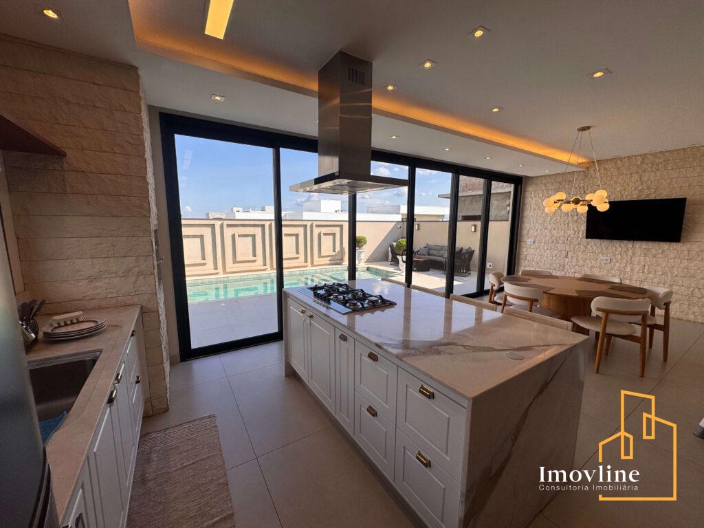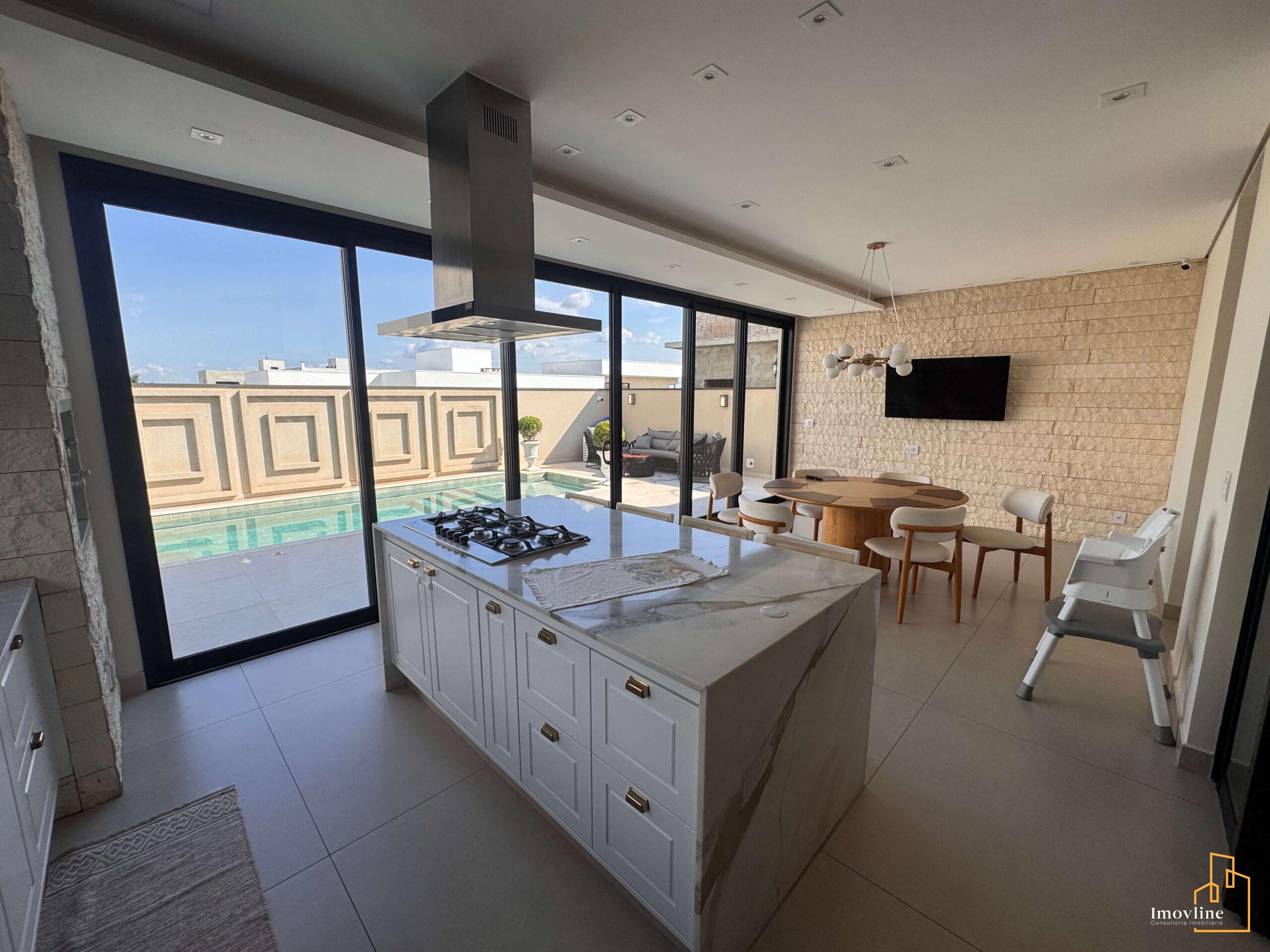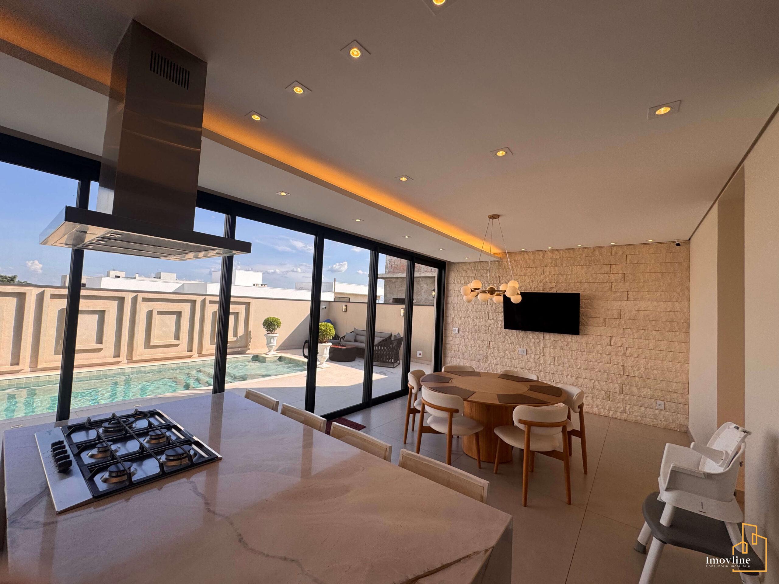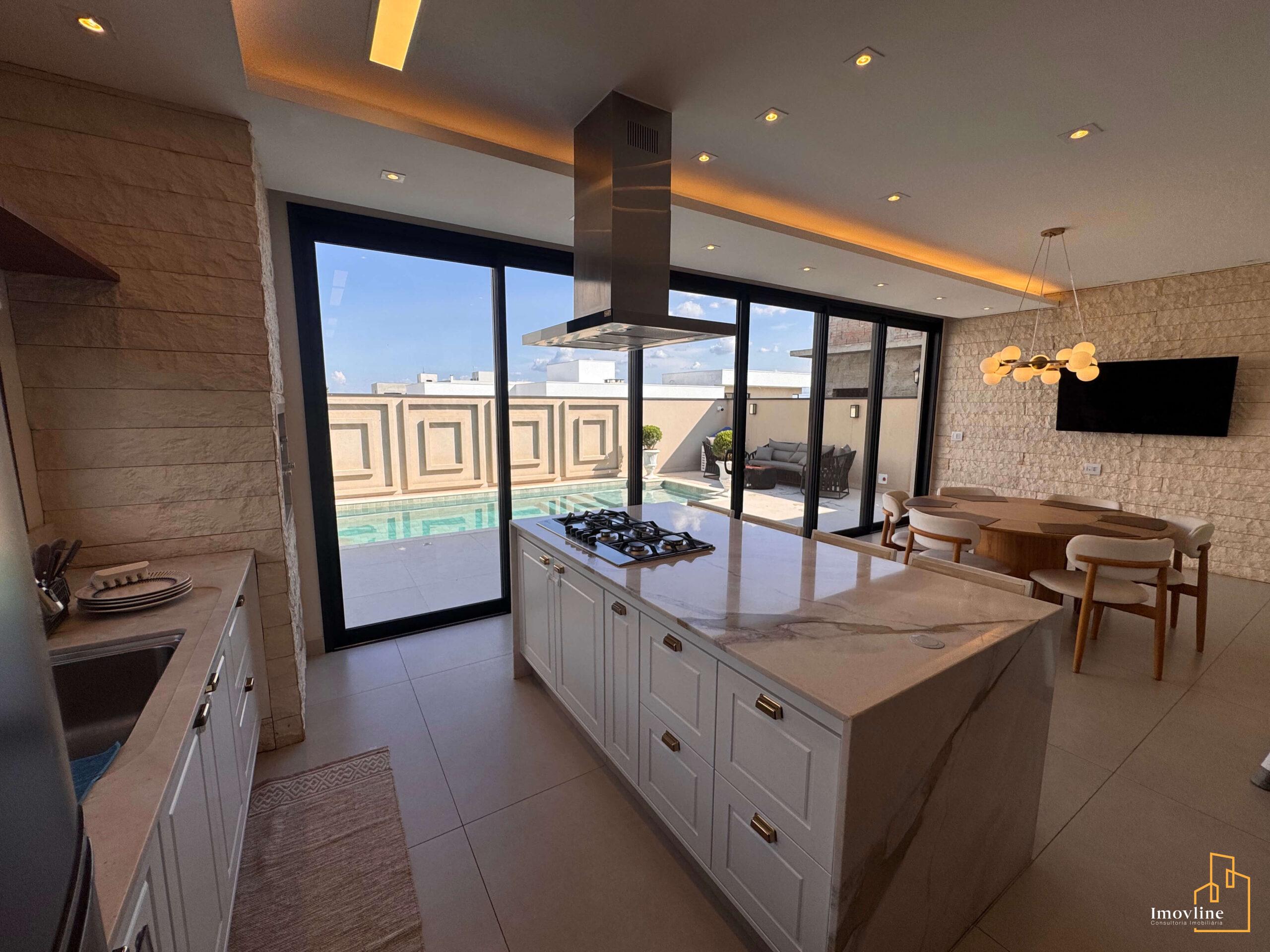 A área social foi pensada para valorizar os momentos em família e receber convidados com conforto. A residência conta com ampla sala de estar, cozinha planejada com ilha central integrada à área gourmet, além de grandes portas de vidro que garantem excelente iluminação natural e integração com o espaço externo.