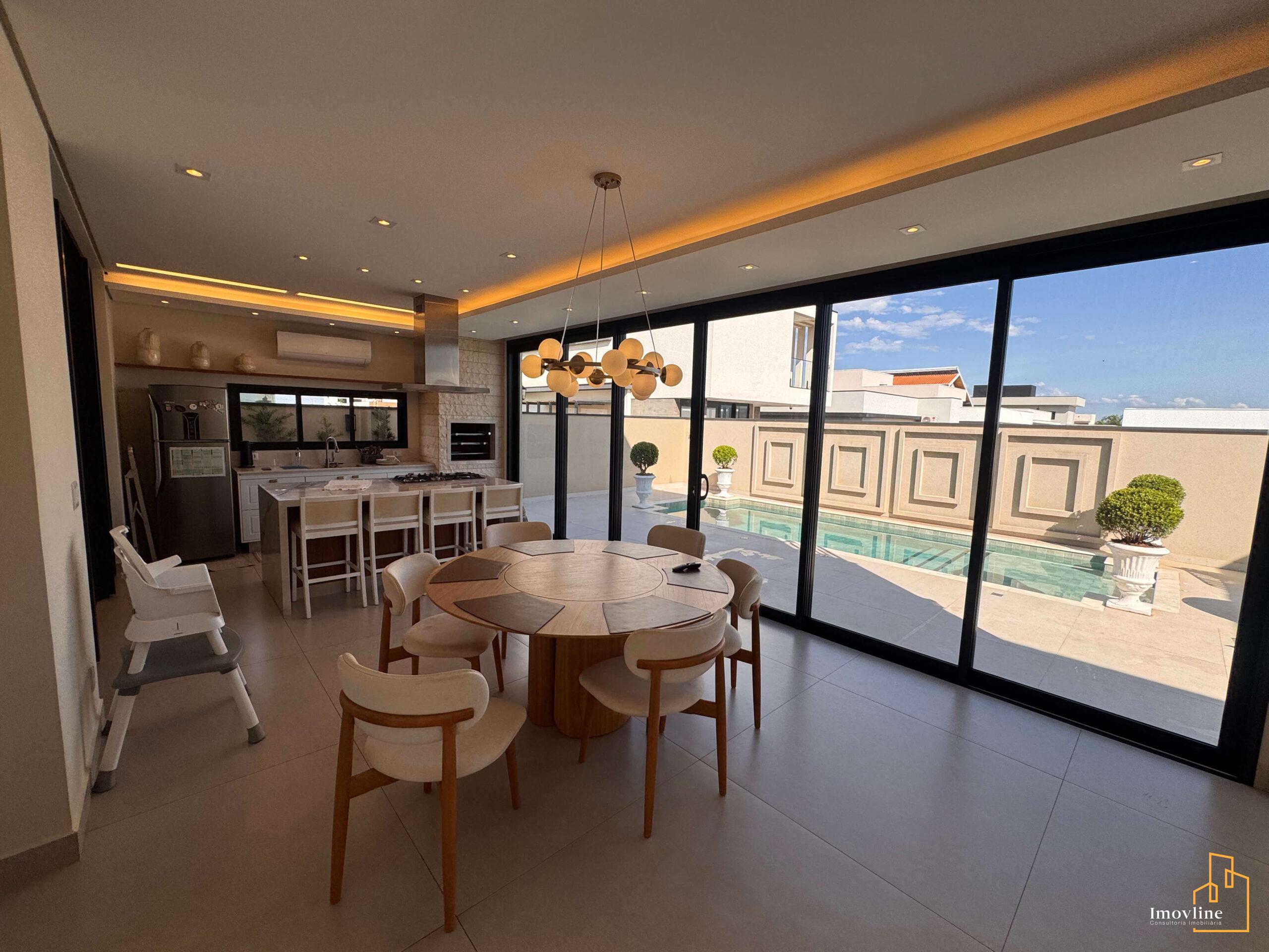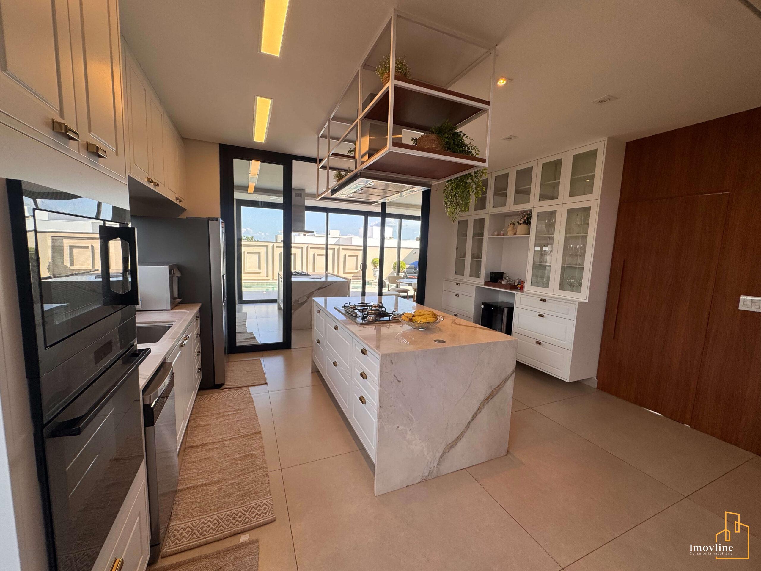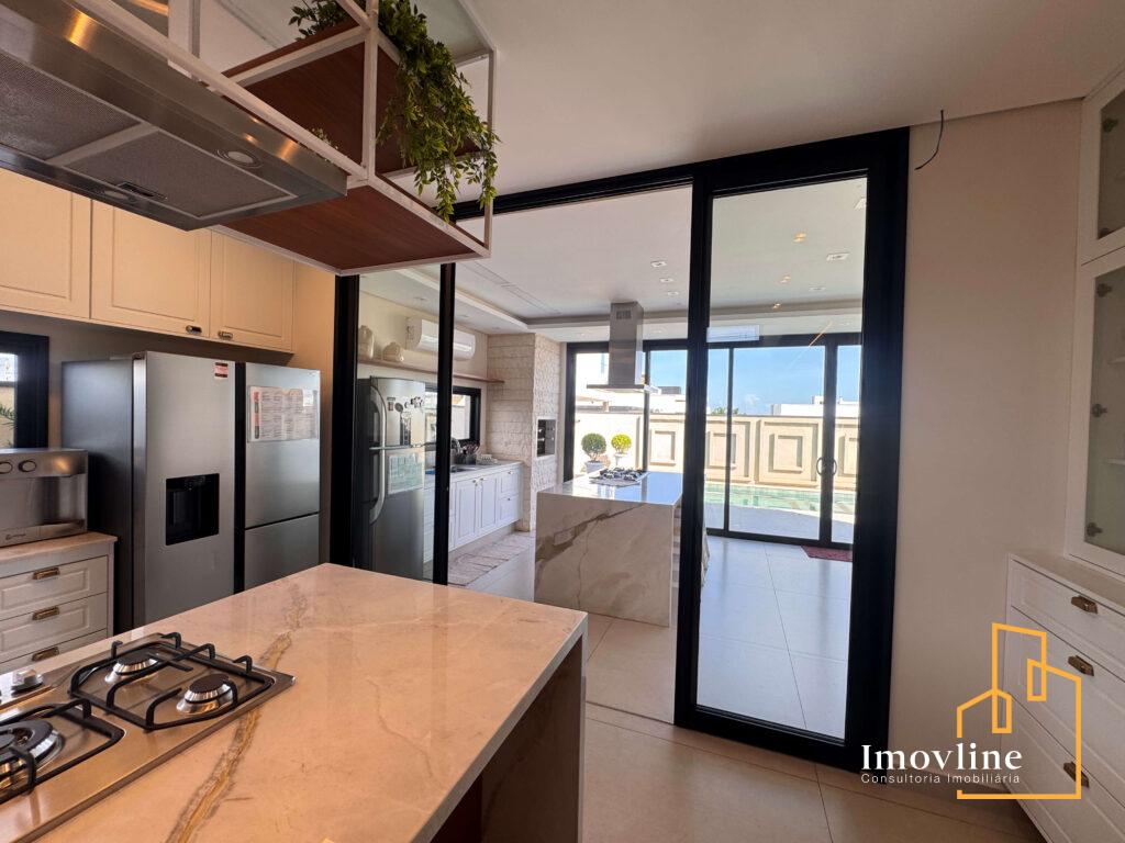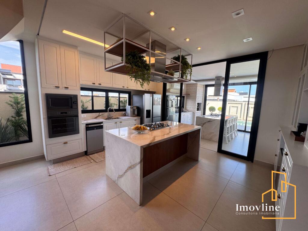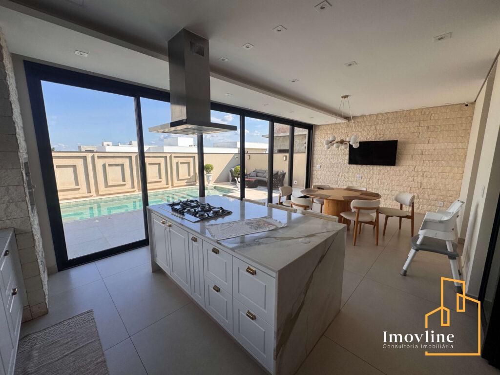 A área social foi pensada para valorizar os momentos em família e receber convidados com conforto. A residência conta com ampla sala de estar, cozinha planejada com ilha central integrada à área gourmet, além de grandes portas de vidro que garantem excelente iluminação natural e integração com o espaço externo.