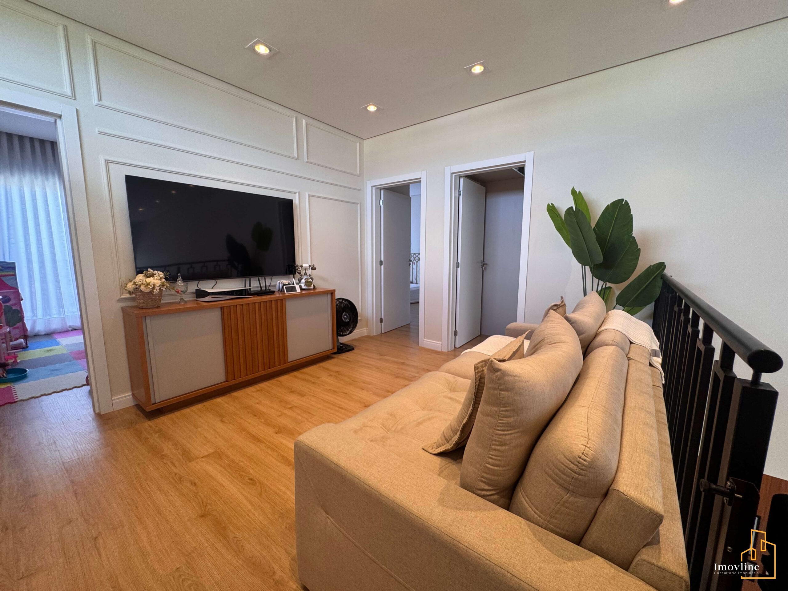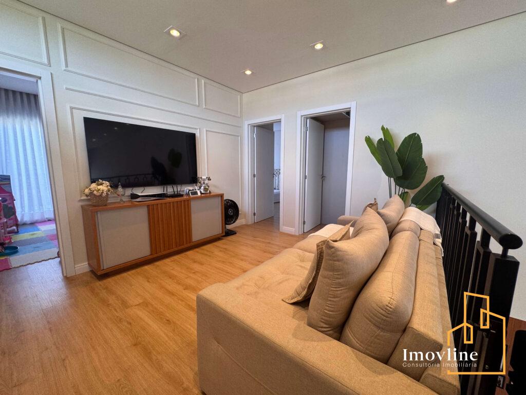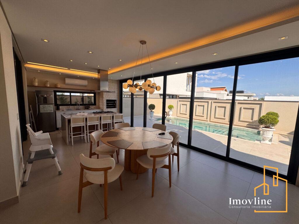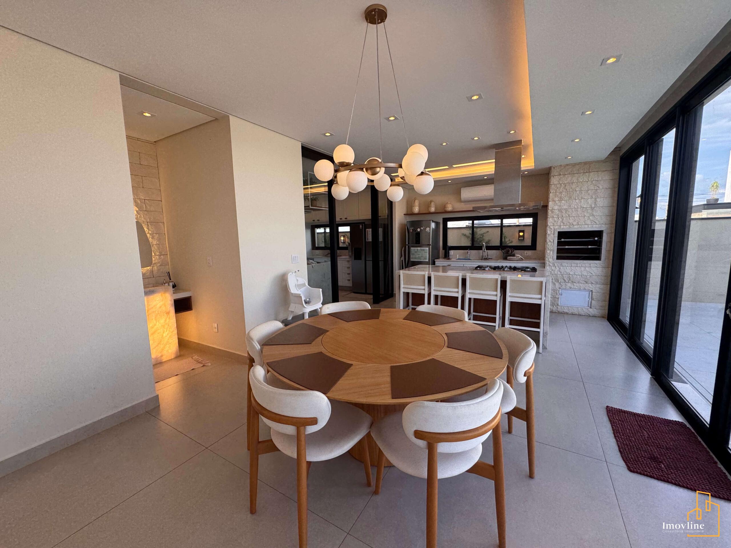 A área social foi pensada para valorizar os momentos em família e receber convidados com conforto. A residência conta com ampla sala de estar, cozinha planejada com ilha central integrada à área gourmet, além de grandes portas de vidro que garantem excelente iluminação natural e integração com o espaço externo.